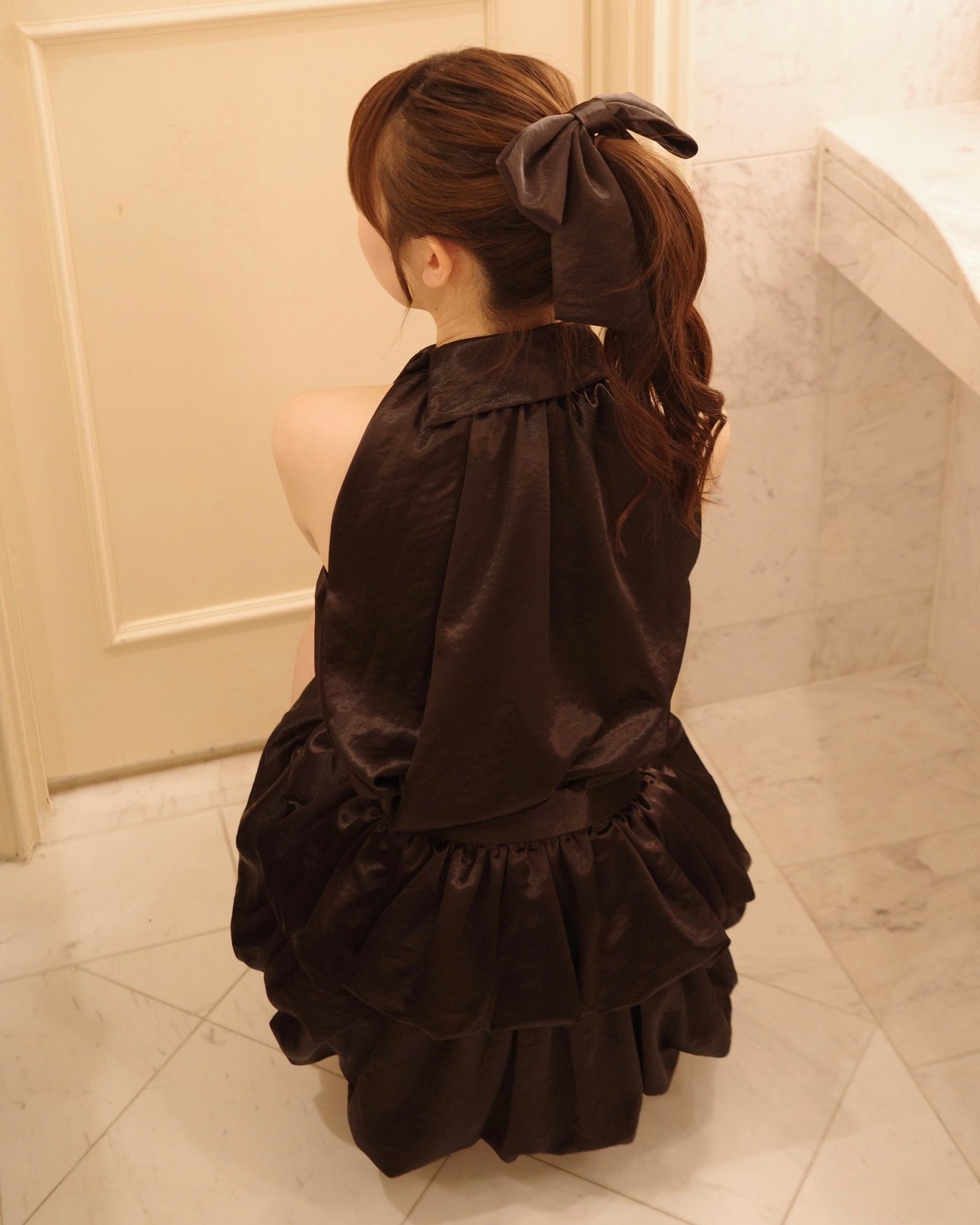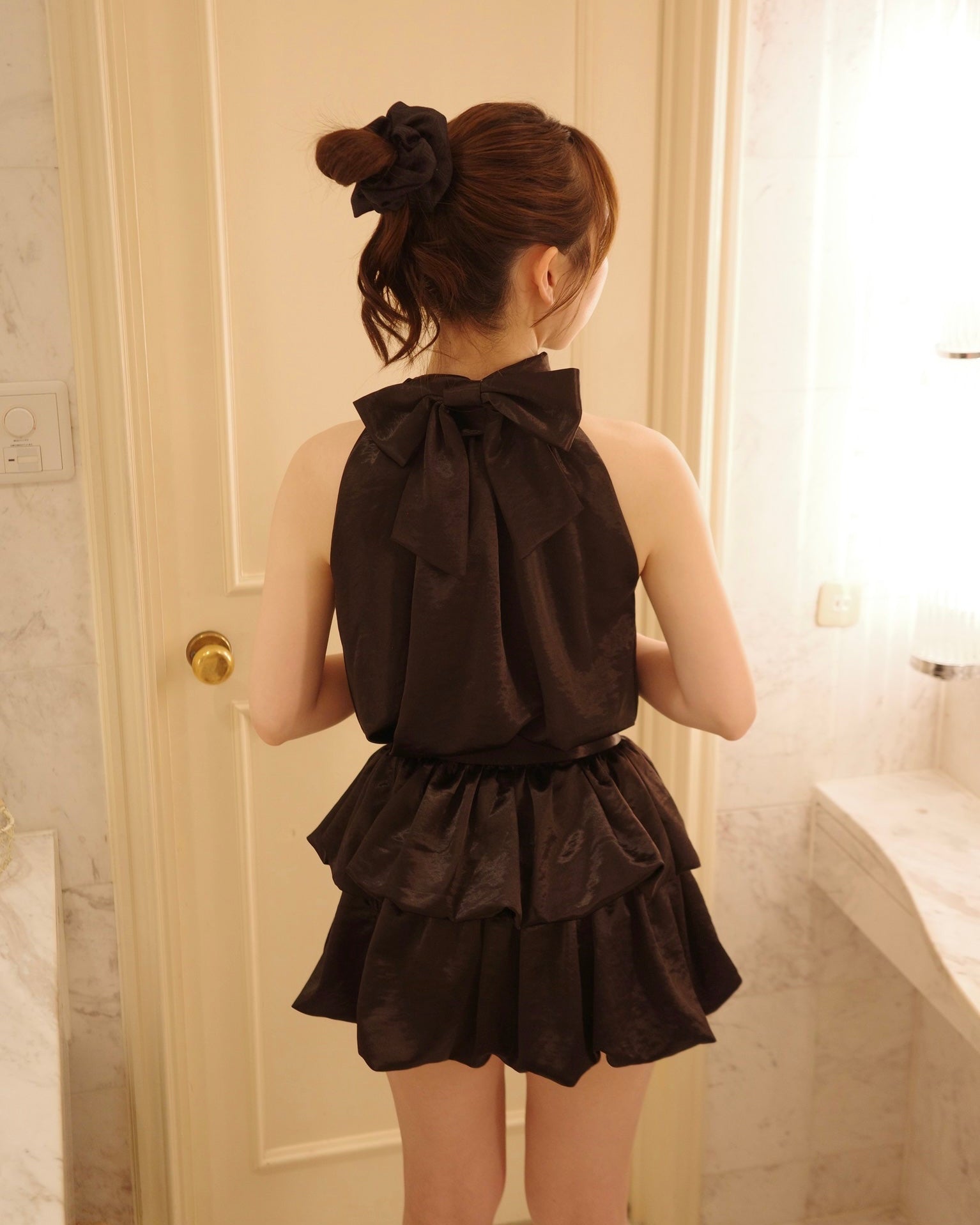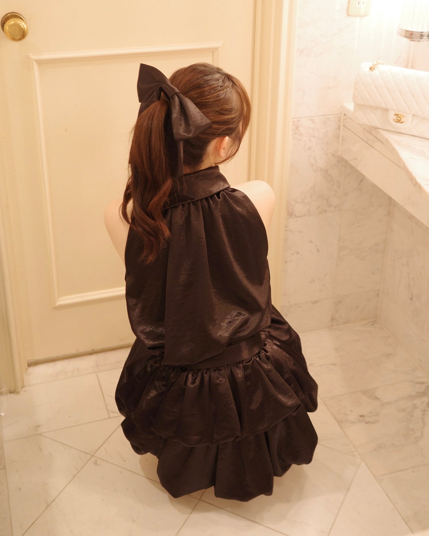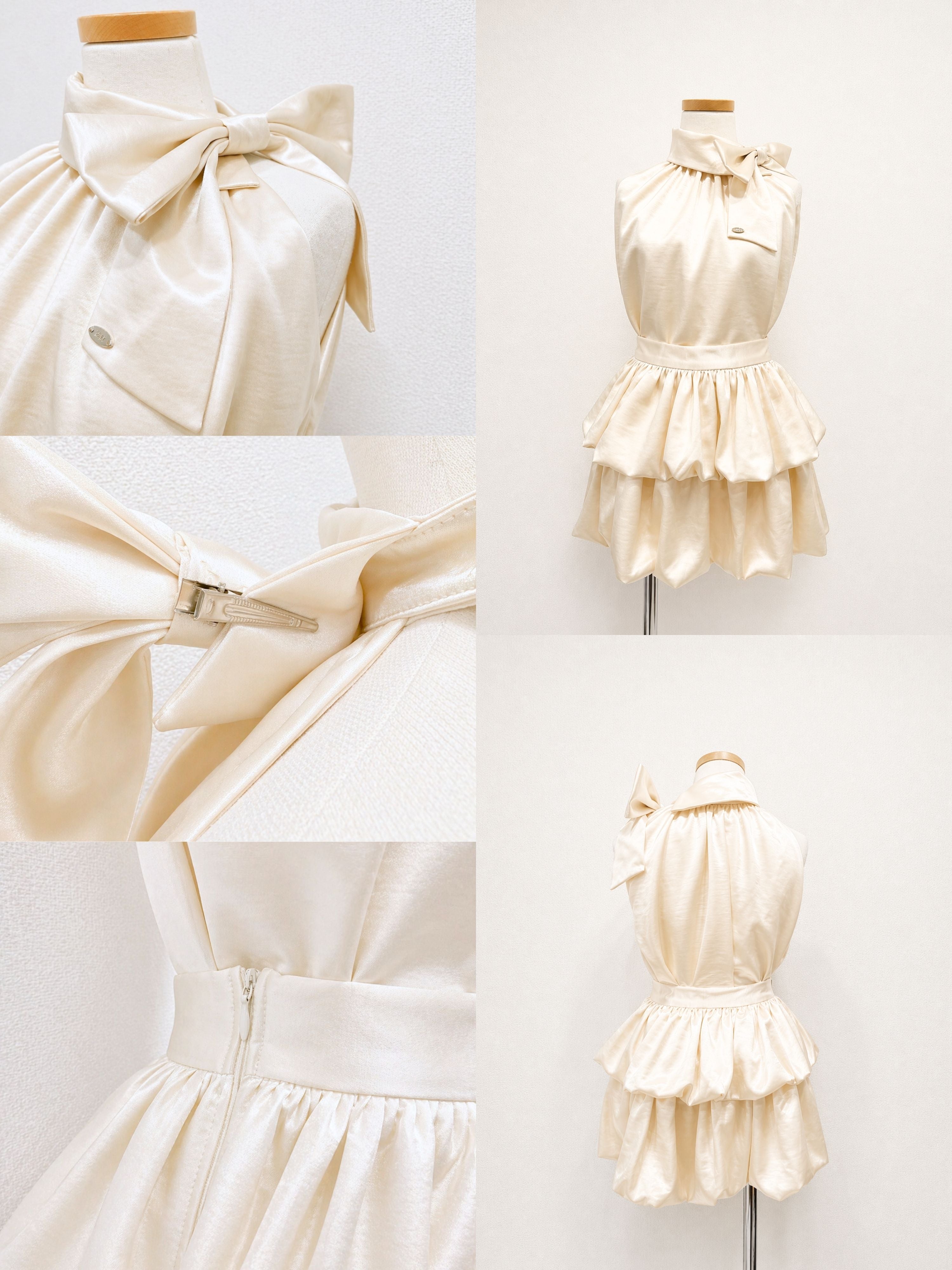 首元のリボンデザインが視線を引き上げ、デコルテラインを美しく見せながら女性らしさを引き立ててくれる1枚。リボンにはさりげなくCielのロゴプレートをあしらい、シンプルながらも特別感のある仕上がりに。