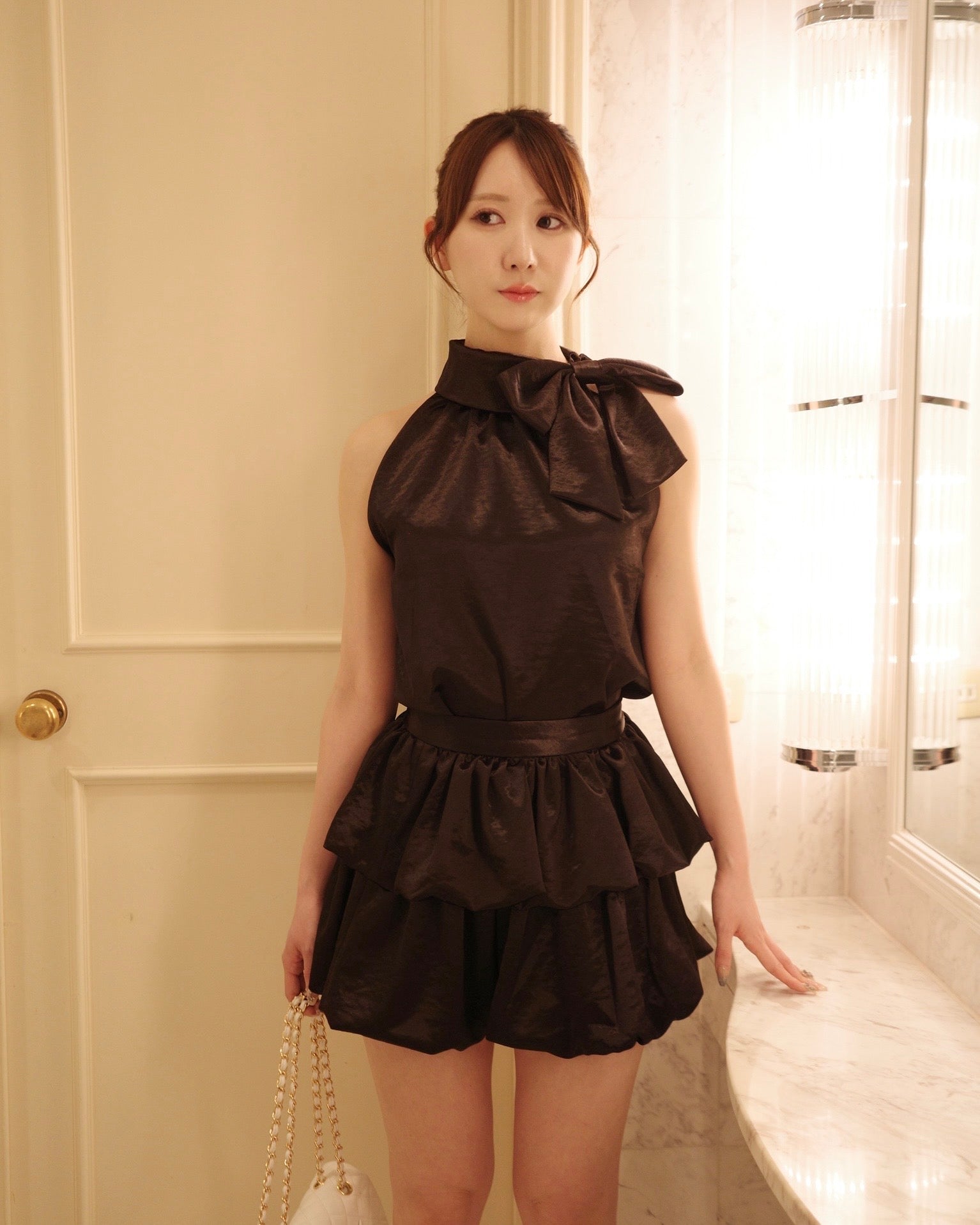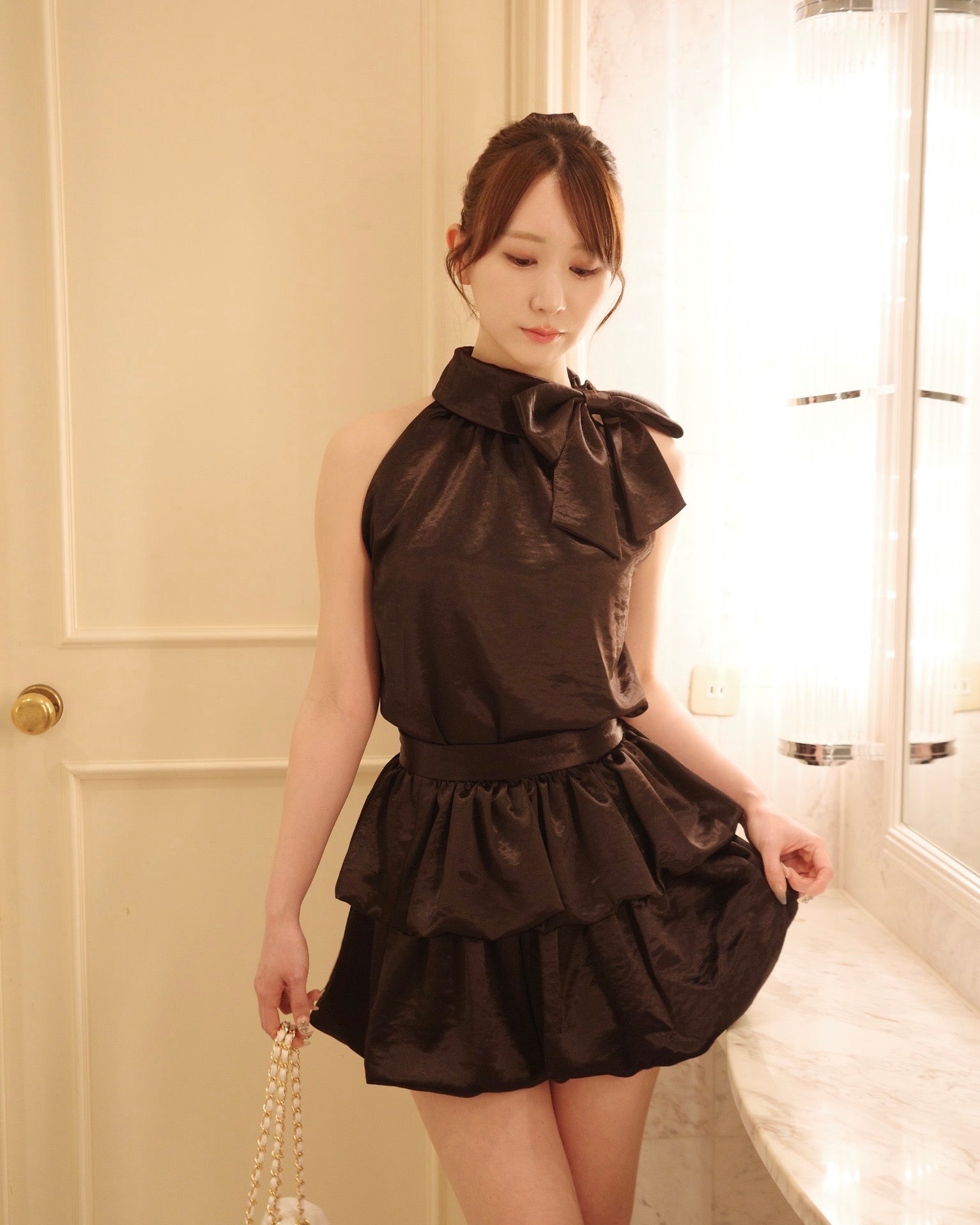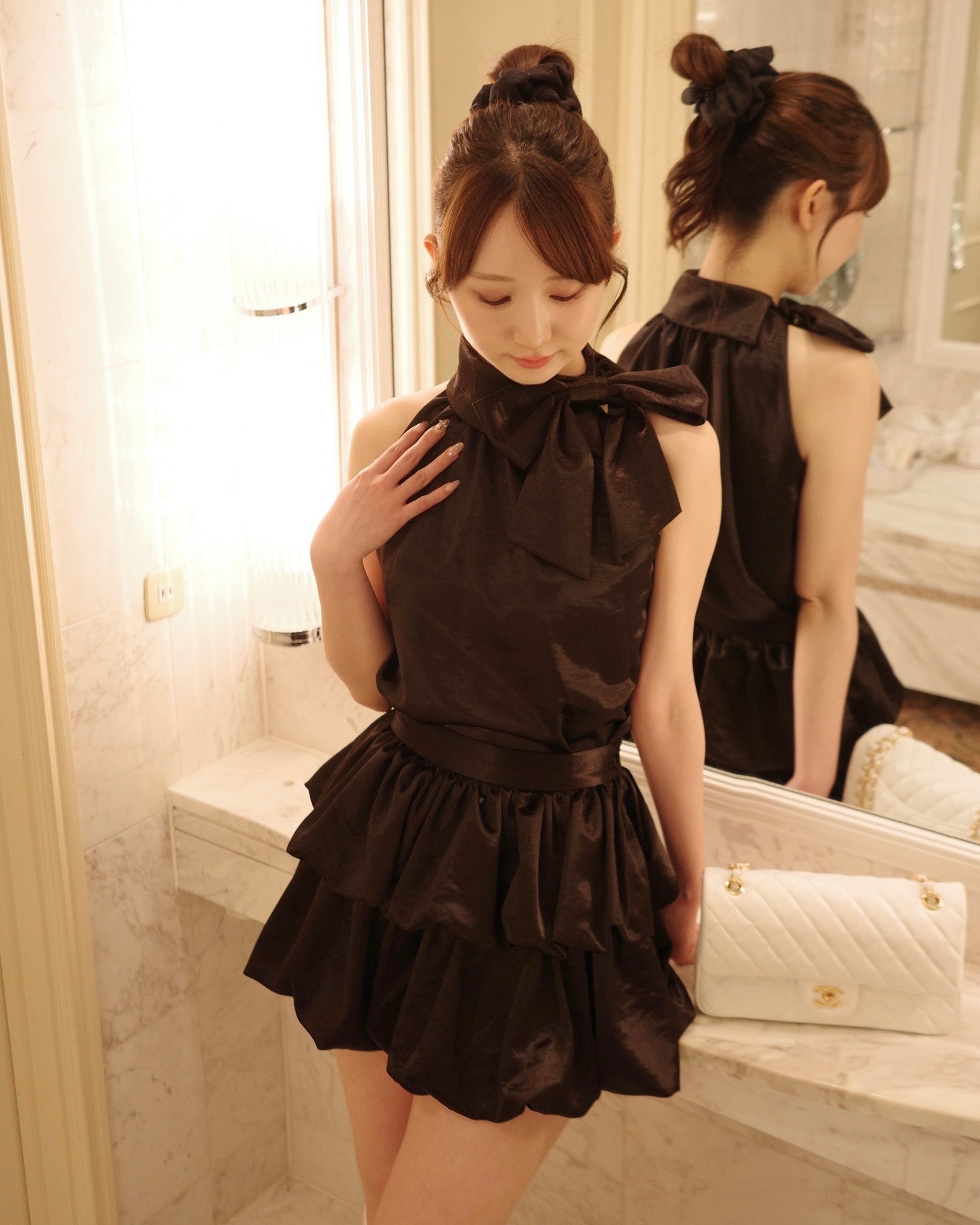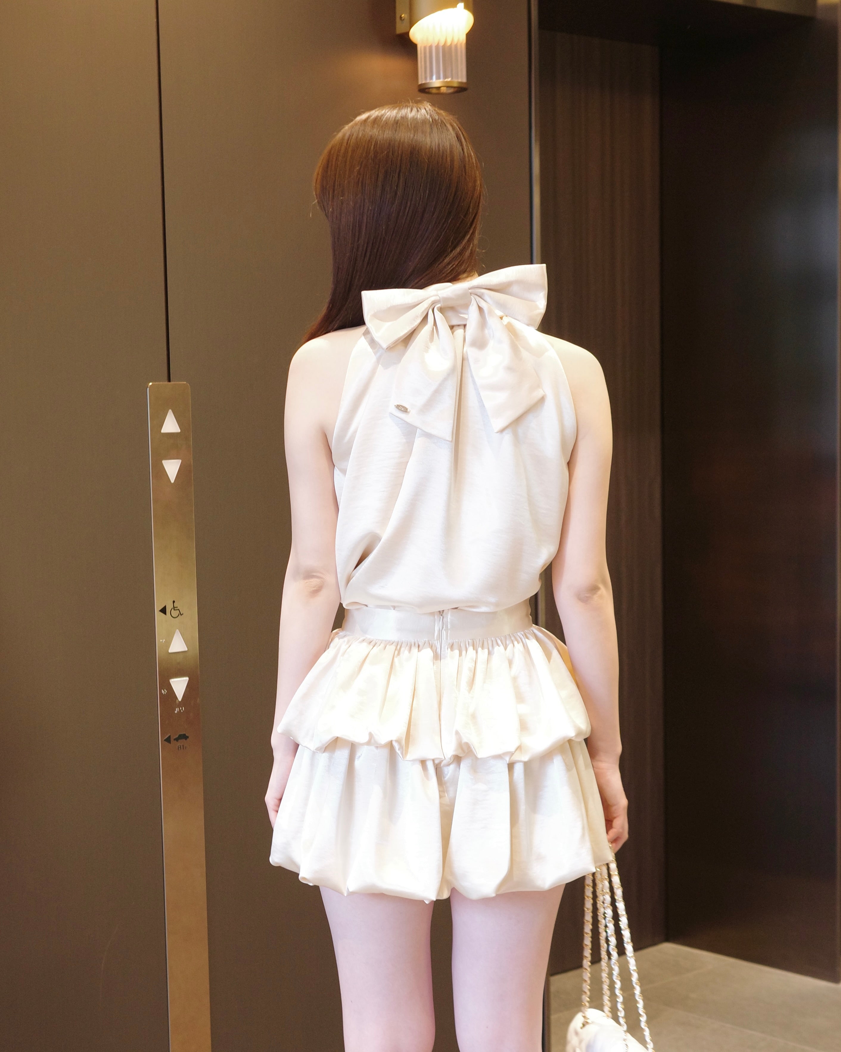 首元のリボンデザインが視線を引き上げ、デコルテラインを美しく見せながら女性らしさを引き立ててくれる1枚。リボンにはさりげなくCielのロゴプレートをあしらい、シンプルながらも特別感のある仕上がりに。