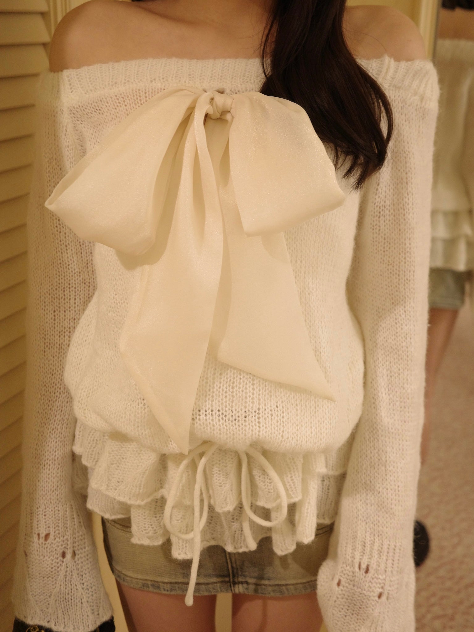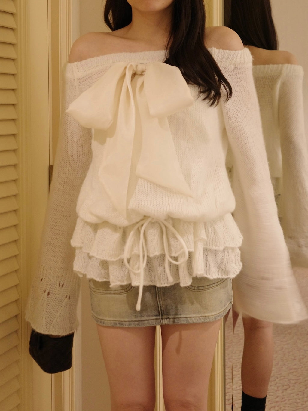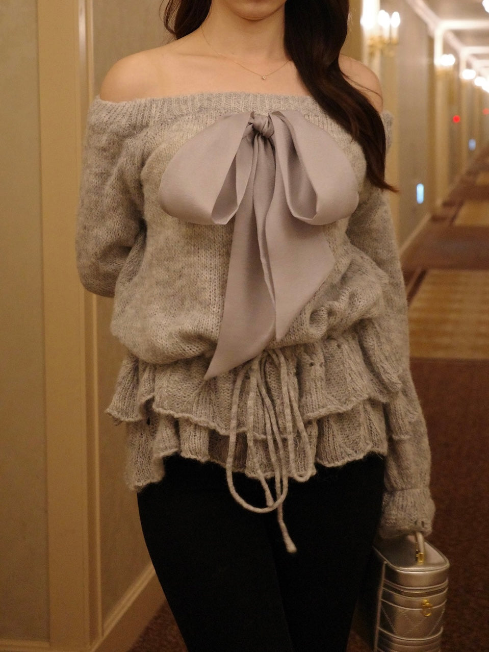 透け感のあるニット素材のオフショルトップス。デコルテをきれいに見せるオフショルデザインに、存在感のある大きめリボンをプラス。さらに腰元のリボンと2段フリルの裾デザインが華やかさを演出し、どの角度から見ても可愛い仕上がりに。デニムやスカートに合わせるだけで、フェミニンで可愛らしいスタイルが完成します♡