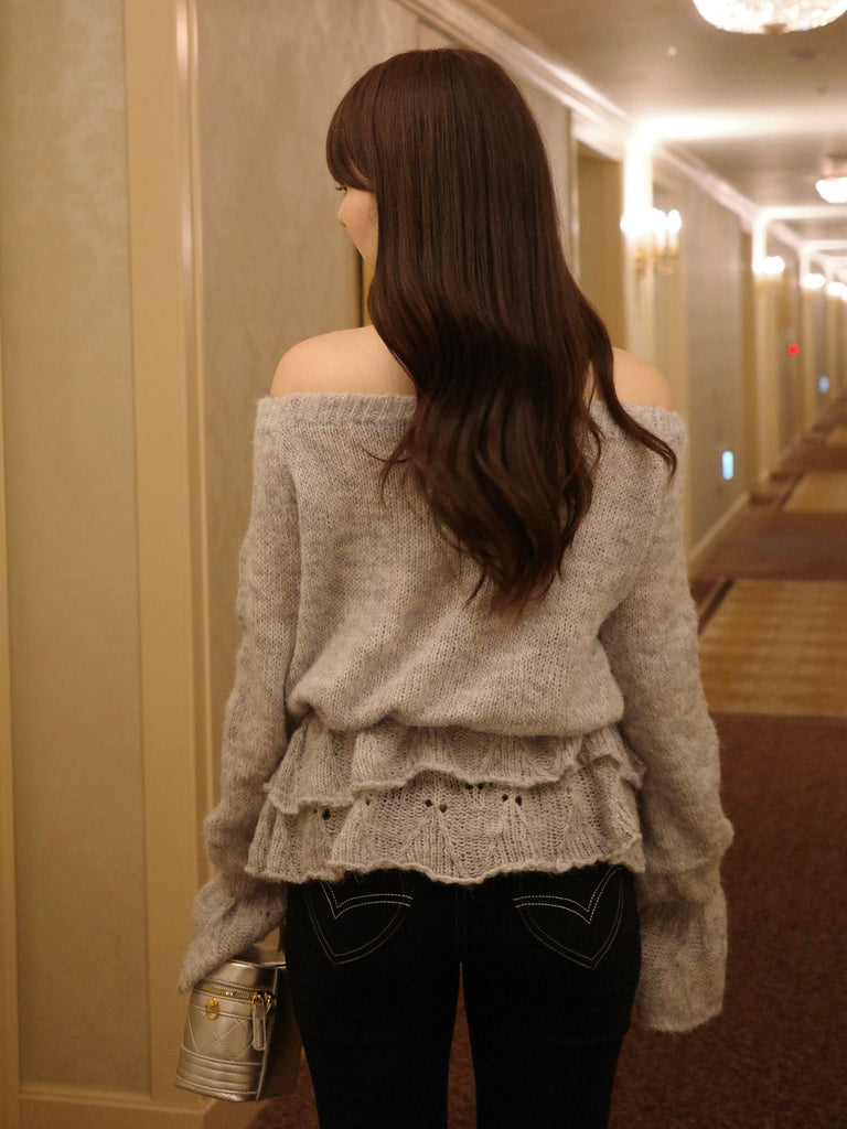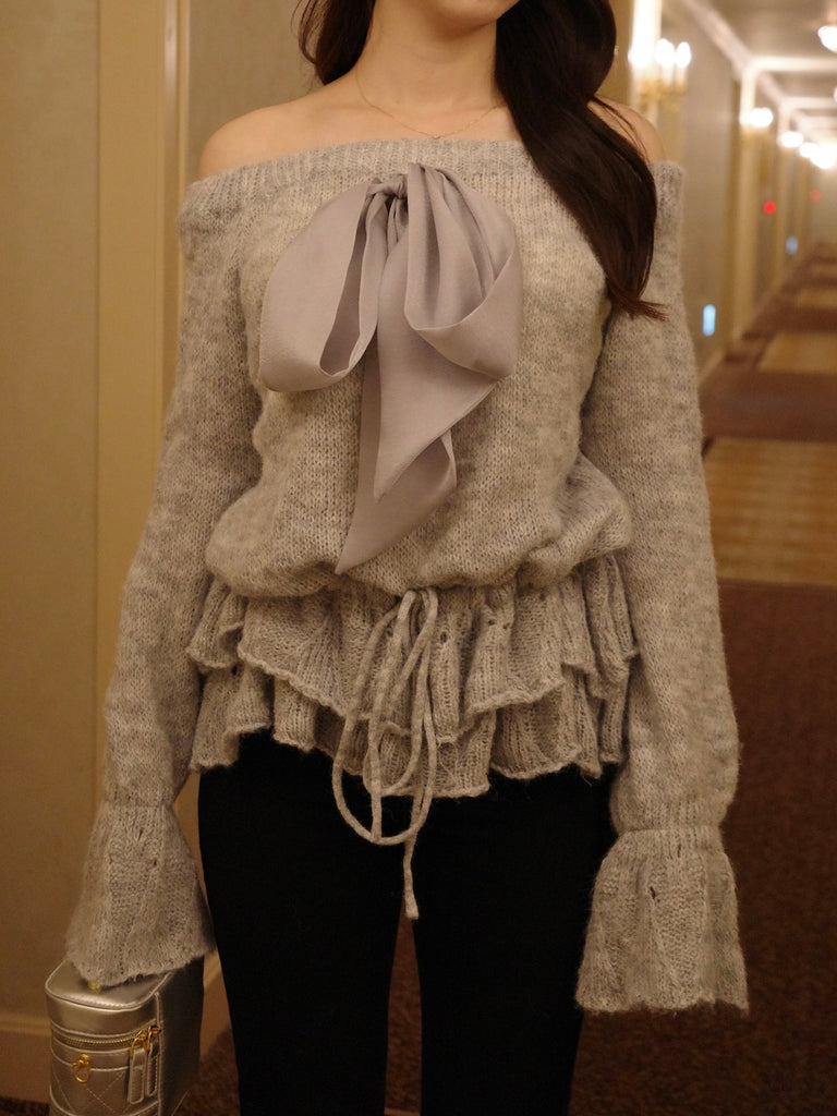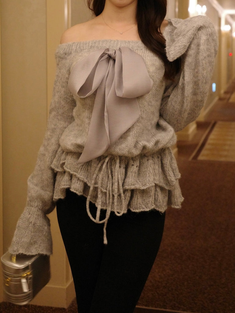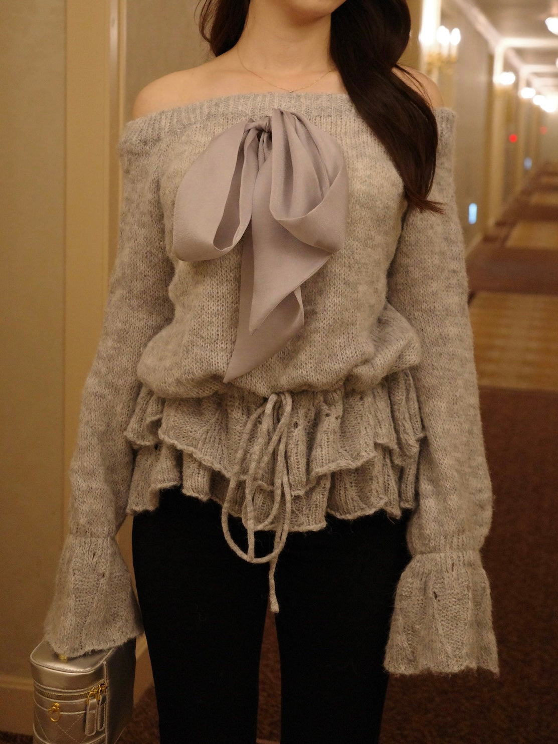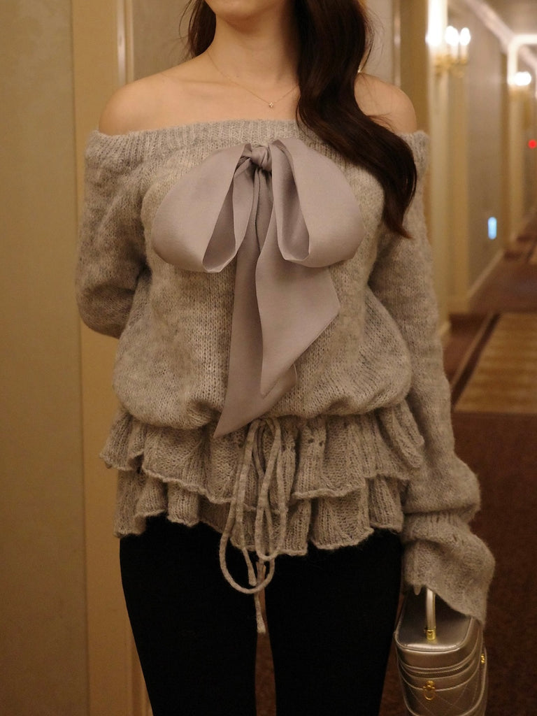 透け感のあるニット素材のオフショルトップス。デコルテをきれいに見せるオフショルデザインに、存在感のある大きめリボンをプラス。さらに腰元のリボンと2段フリルの裾デザインが華やかさを演出し、どの角度から見ても可愛い仕上がりに。デニムやスカートに合わせるだけで、フェミニンで可愛らしいスタイルが完成します♡