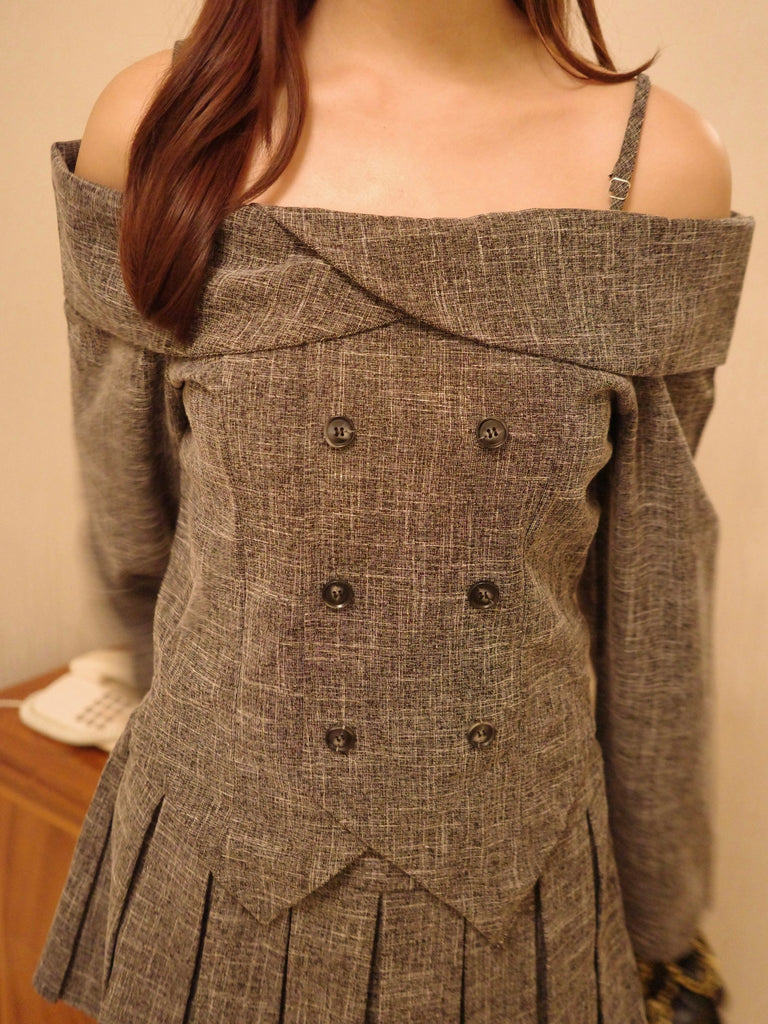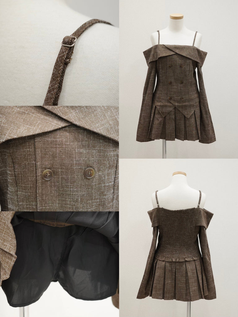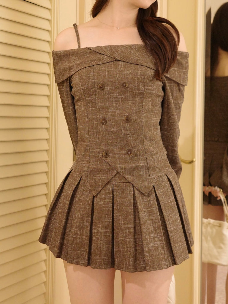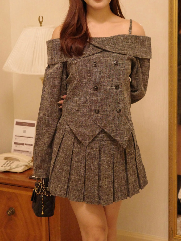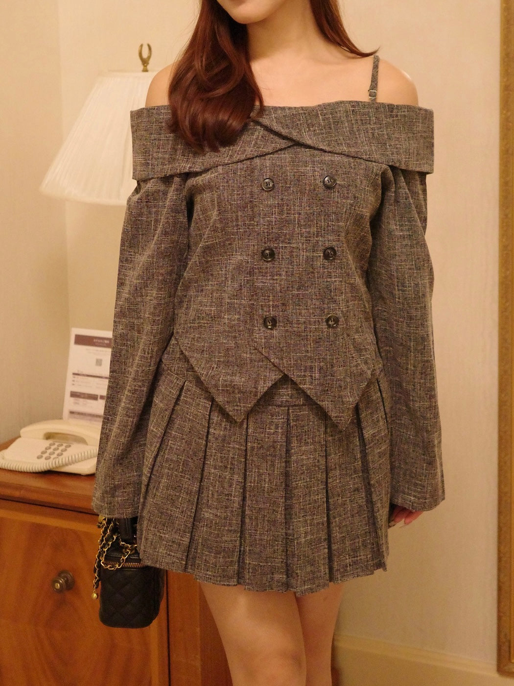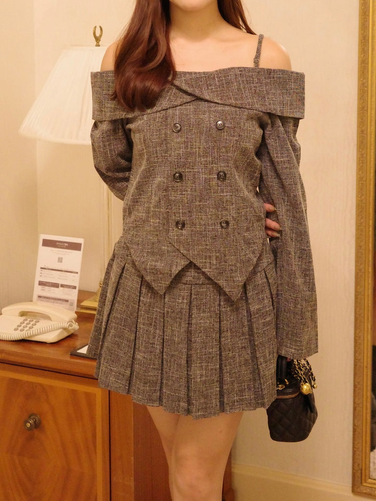 プリーツスカートとオフショルトップスのセットアップです。上品なテーラード風のデザインとオフショルが、女性らしさときちんと感を兼ね備えた雰囲気に仕上がります。スカートは流行りのプリーツデザインで、クラシカルなチェック柄が全体を可愛らしく引き立ててくれます。セットではもちろん、上下別でも着回せる万能アイテム。特別な日のお出かけや、写真映えしたい日にもおすすめです。
