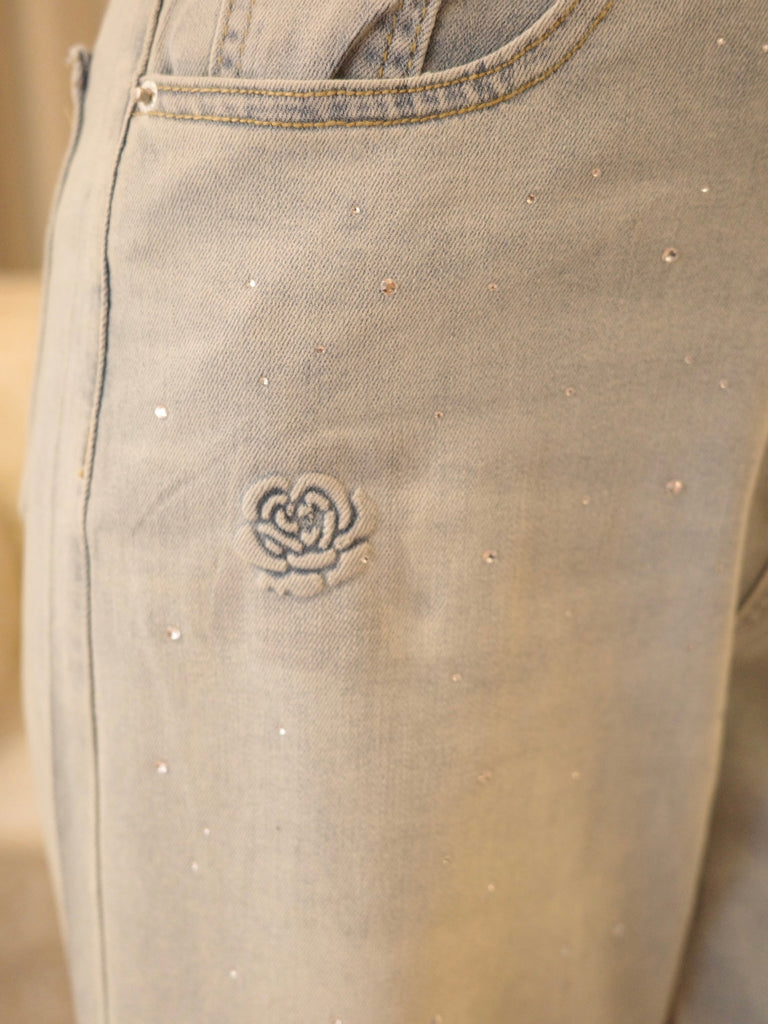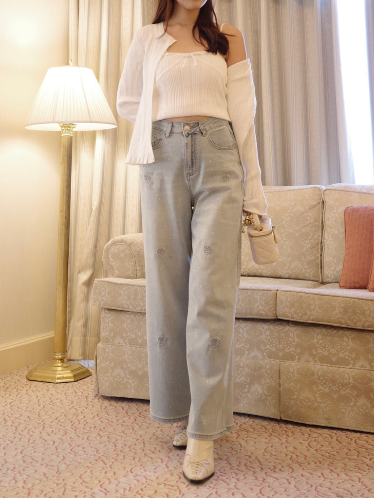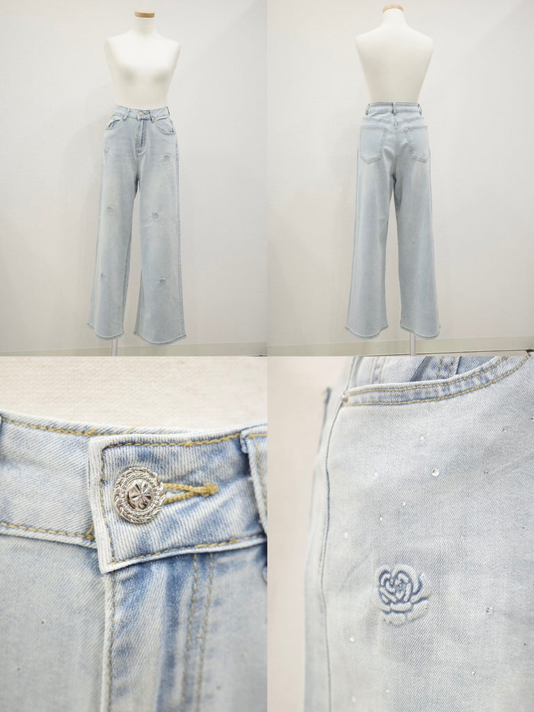 立体的なローズ柄のエンボス刺繍に、細かなラメが散りばめられた主役級のワイドストレートデニムです。シルエットはゆるやかなストレートラインで、脚のラインを拾いすぎずに美脚見えが叶います。淡めのウォッシュカラーが抜け感をプラス。ガーリーなトップスはもちろん、シンプルなニットやシャツと合わせても華やかに仕上がります。カジュアルの中に、さりげない甘さとこだわりがある1本です。