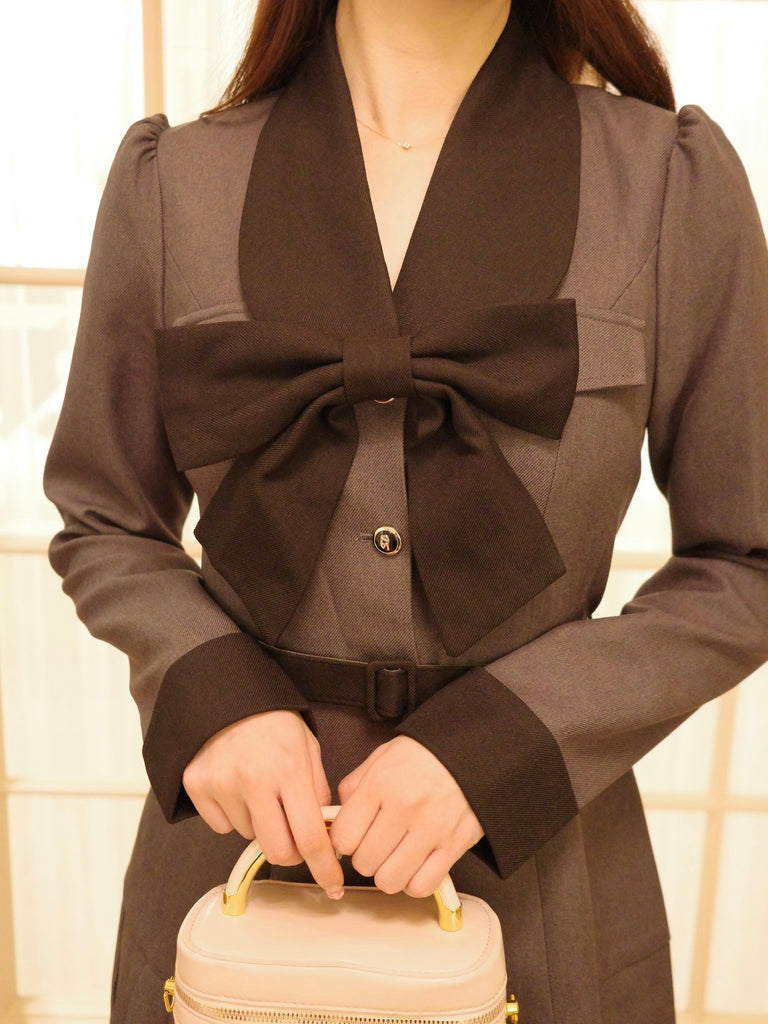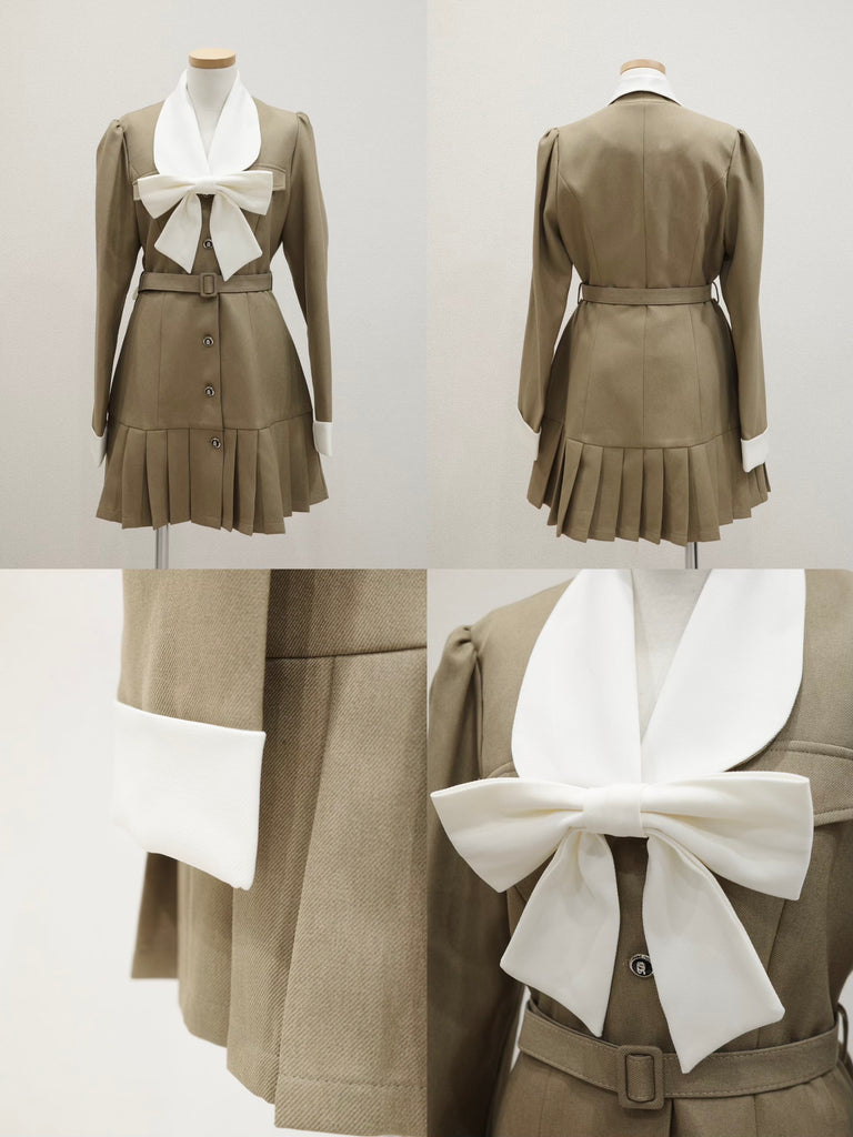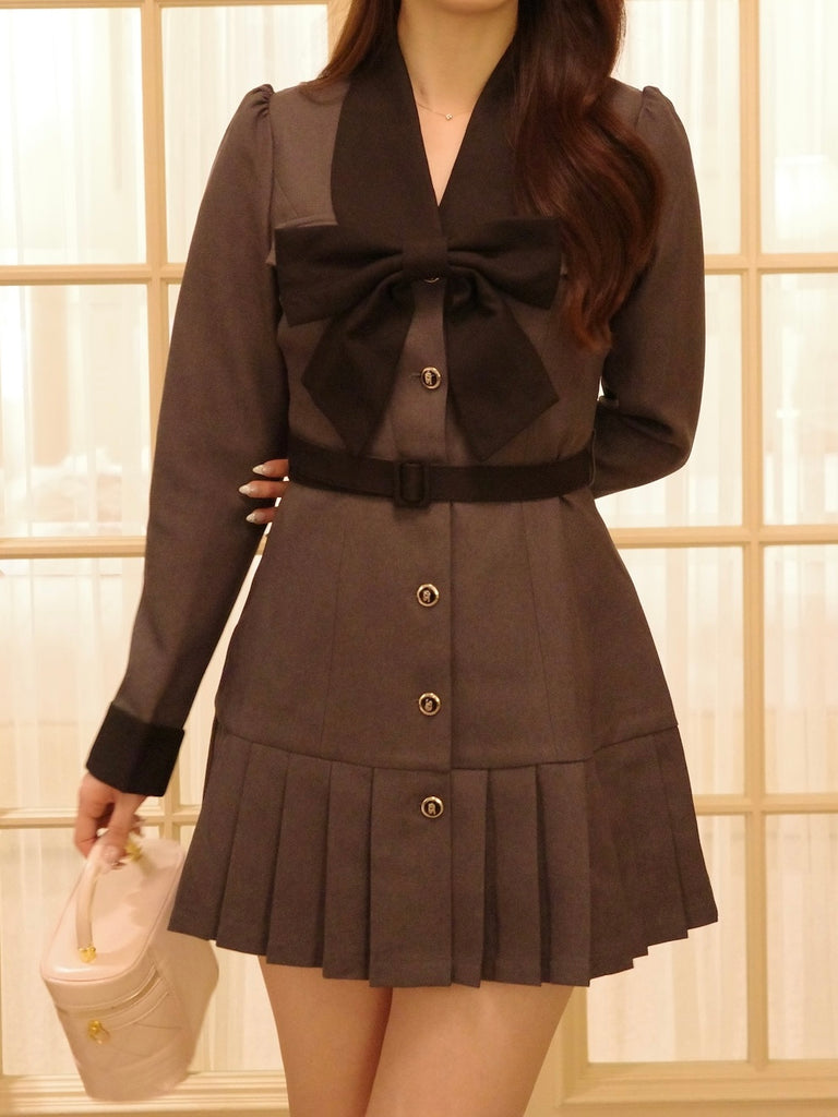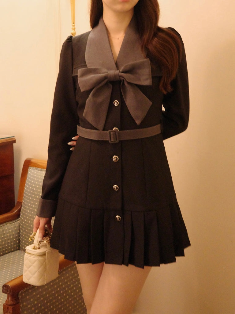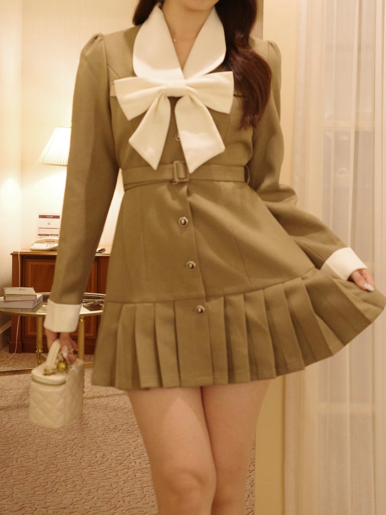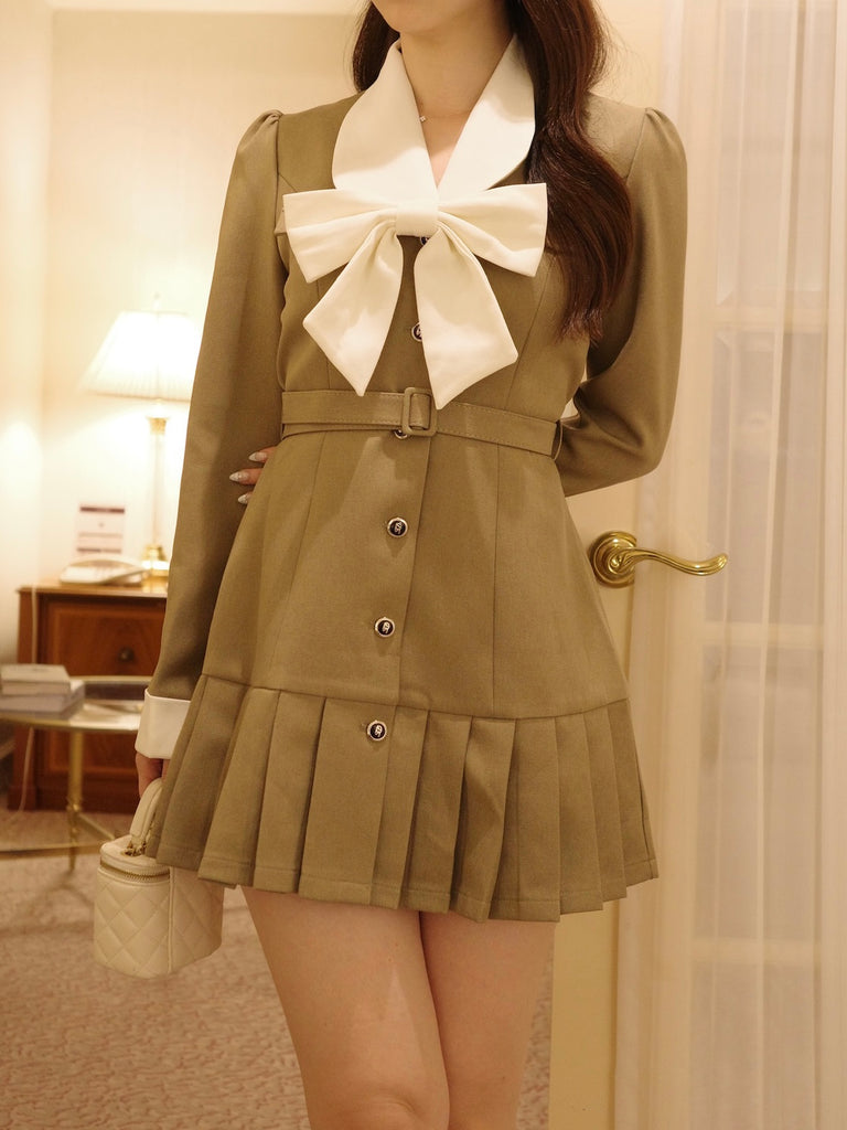 大きなリボンとプリーツが目を惹くワンピースです。上品な配色にテーラード風の襟デザインと裾のプリーツで甘さの中にも大人の雰囲気をプラス。ウエストのベルトと胸元のリボンは取り外し可能なので、TPOや気分に合わせてアレンジが楽しめます。1枚でコーデが決まるクラシカルな主役級アイテムです。