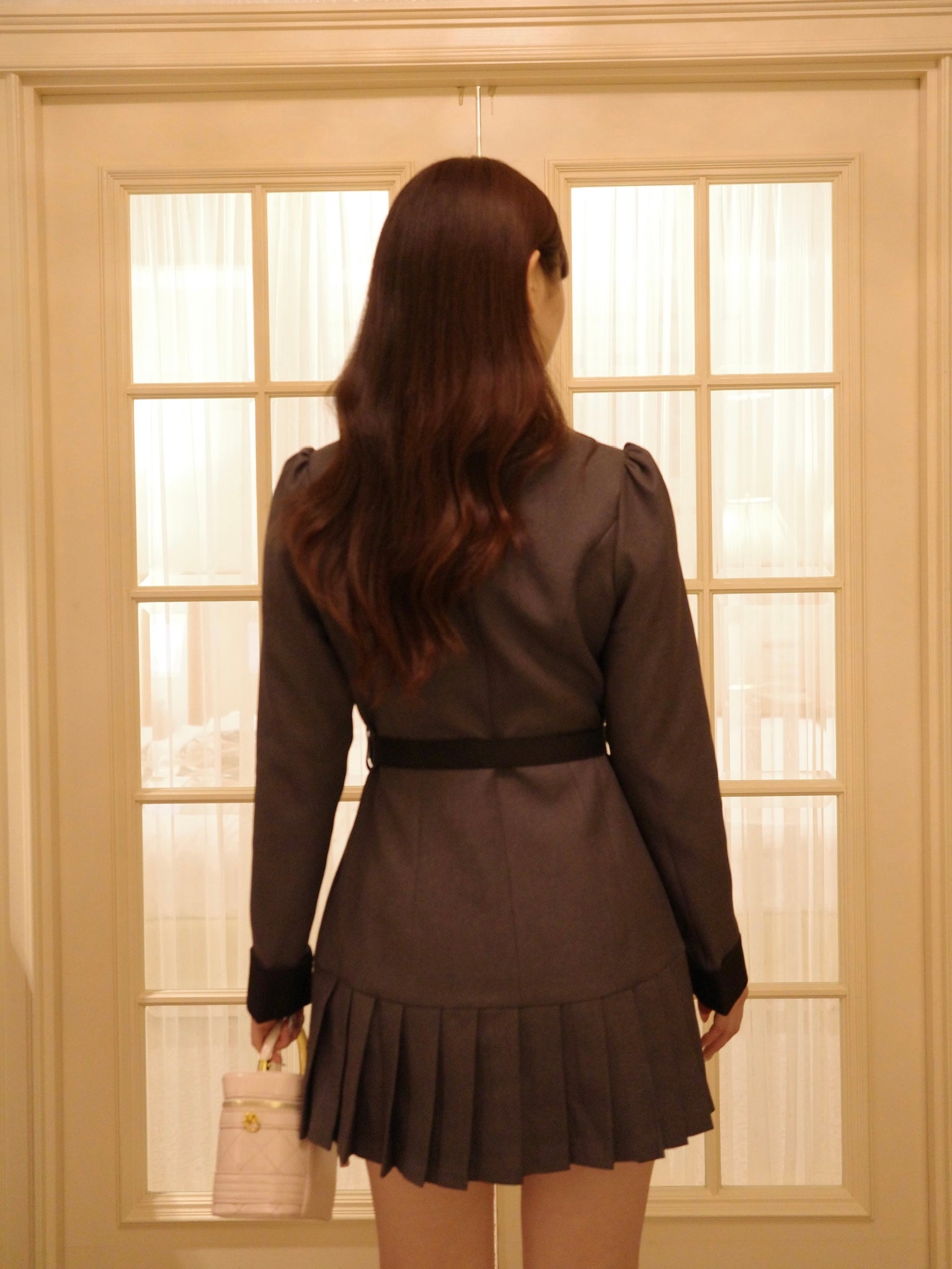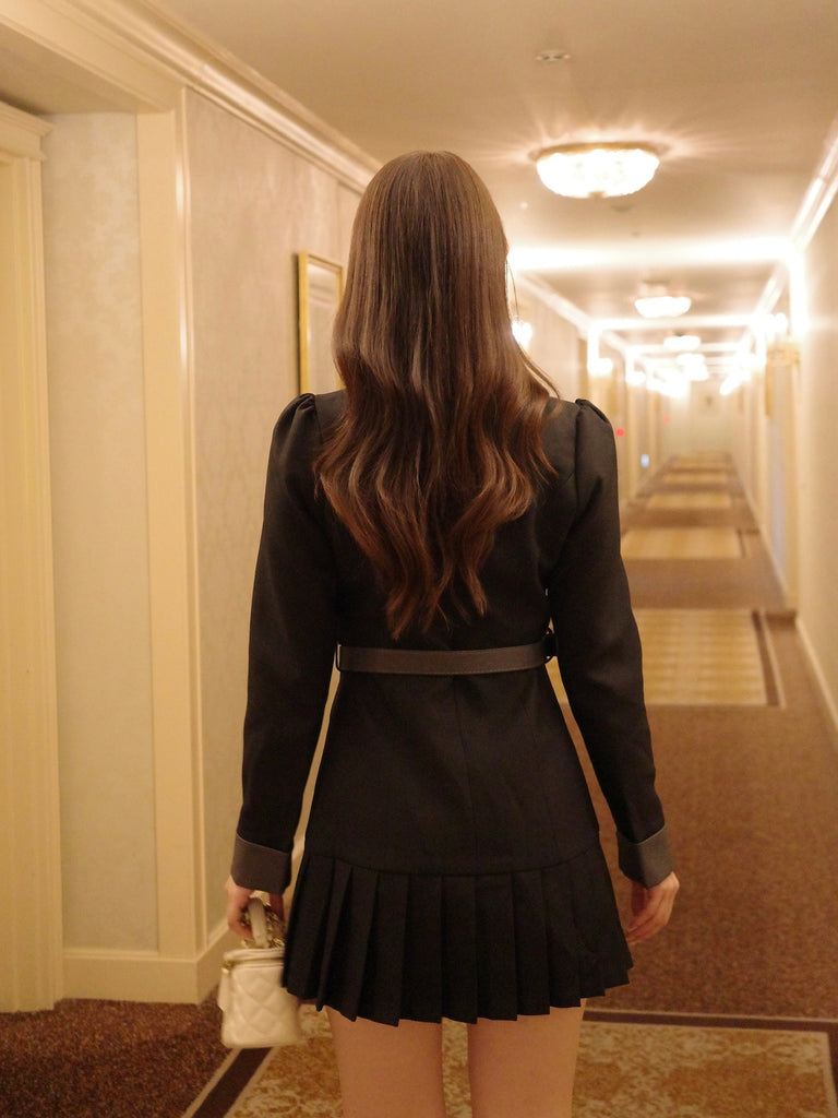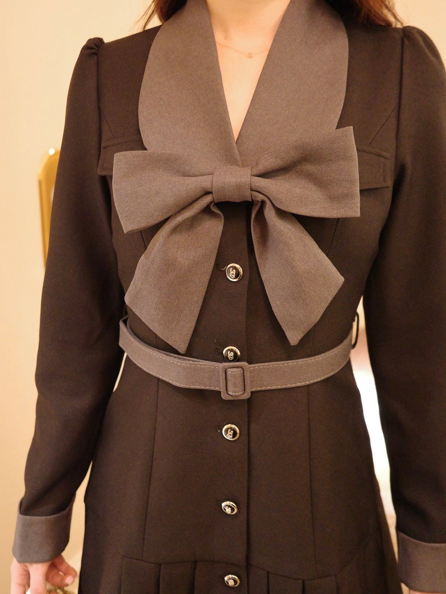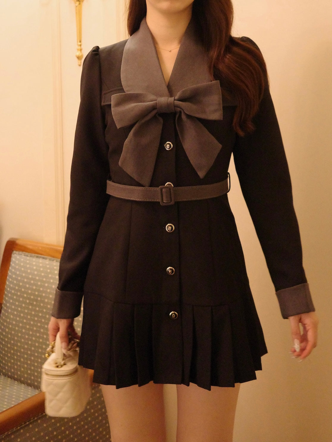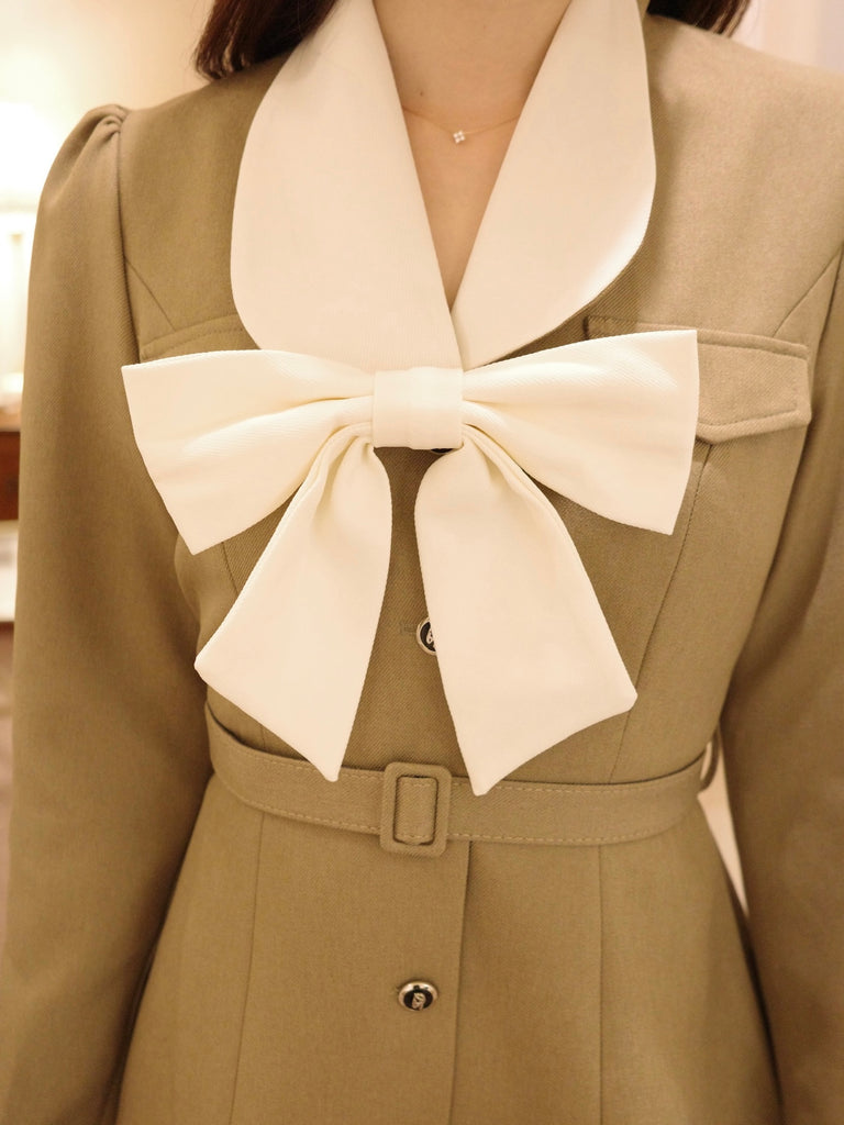 大きなリボンとプリーツが目を惹くワンピースです。上品な配色にテーラード風の襟デザインと裾のプリーツで甘さの中にも大人の雰囲気をプラス。ウエストのベルトと胸元のリボンは取り外し可能なので、TPOや気分に合わせてアレンジが楽しめます。1枚でコーデが決まるクラシカルな主役級アイテムです。