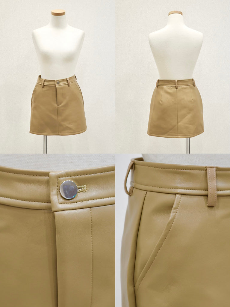 フェイクレザーミニスカートです。すっきりとした台形シルエットが脚をまっすぐ綺麗に見せてくれ、コンパクトな丈感でスタイルアップ効果も抜群。柔らかくなめらかなフェイクレザーを使用しているため、動きやすく履き心地も◎。ウエスト部分のさりげないボタンディテールでトップスをインしたときも映える仕様になっています。オールシーズン使える万能アイテムです。