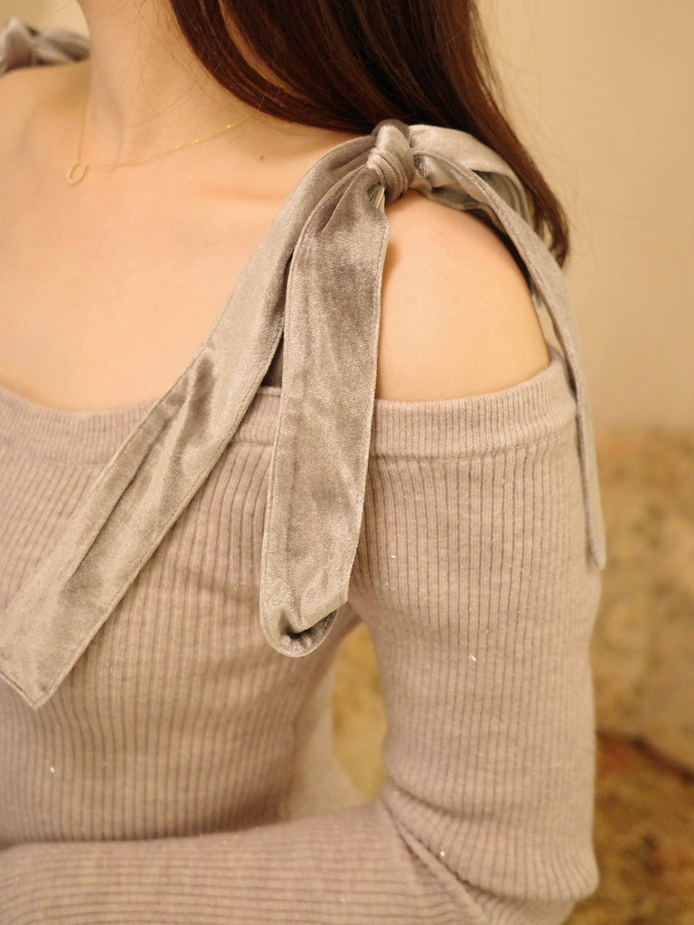 肩には大きめのベロアリボンを結び、ほんのり肌見せできるオープンショルダー仕様。甘さのなかに上品な抜け感をプラスしました。