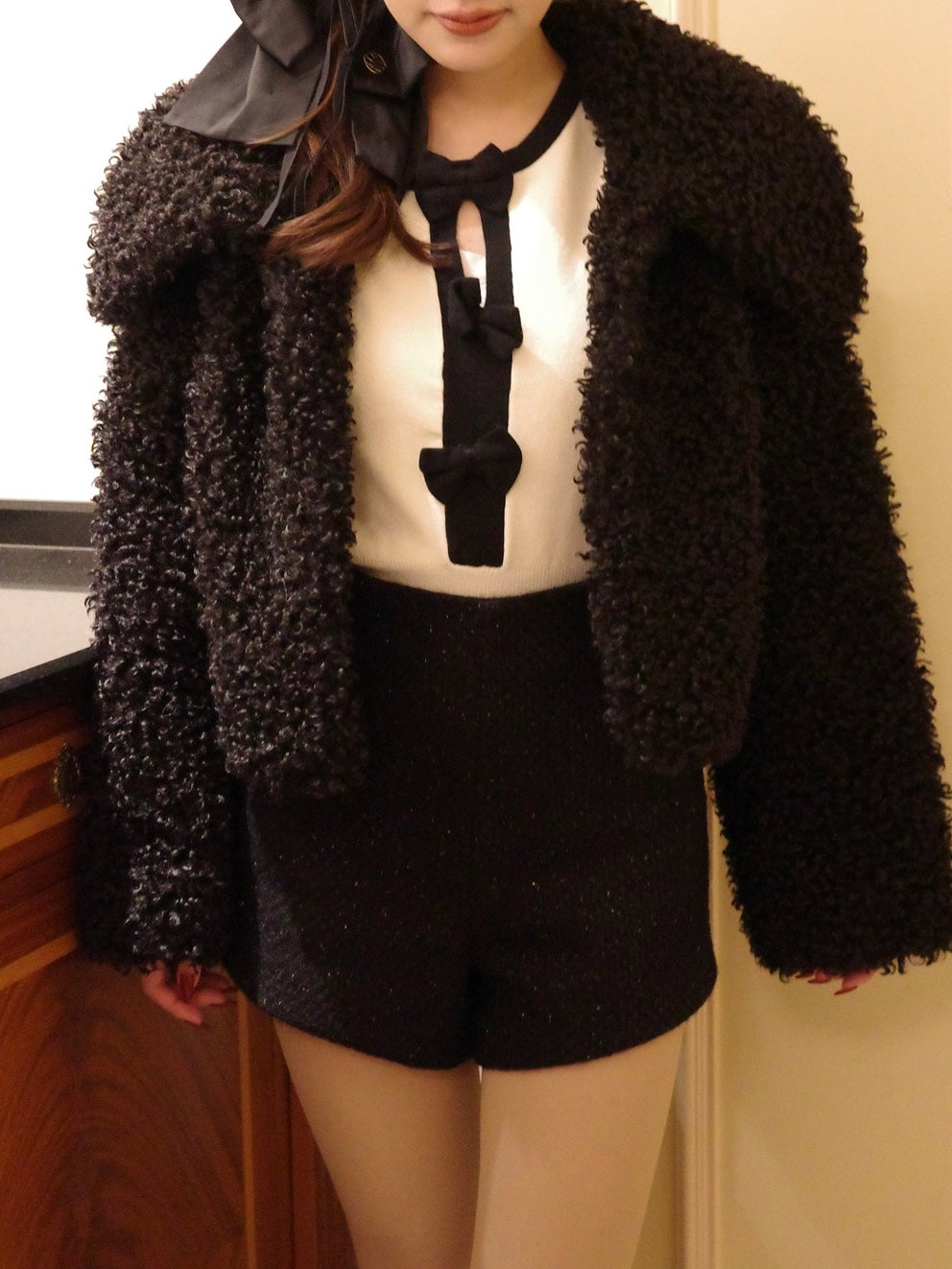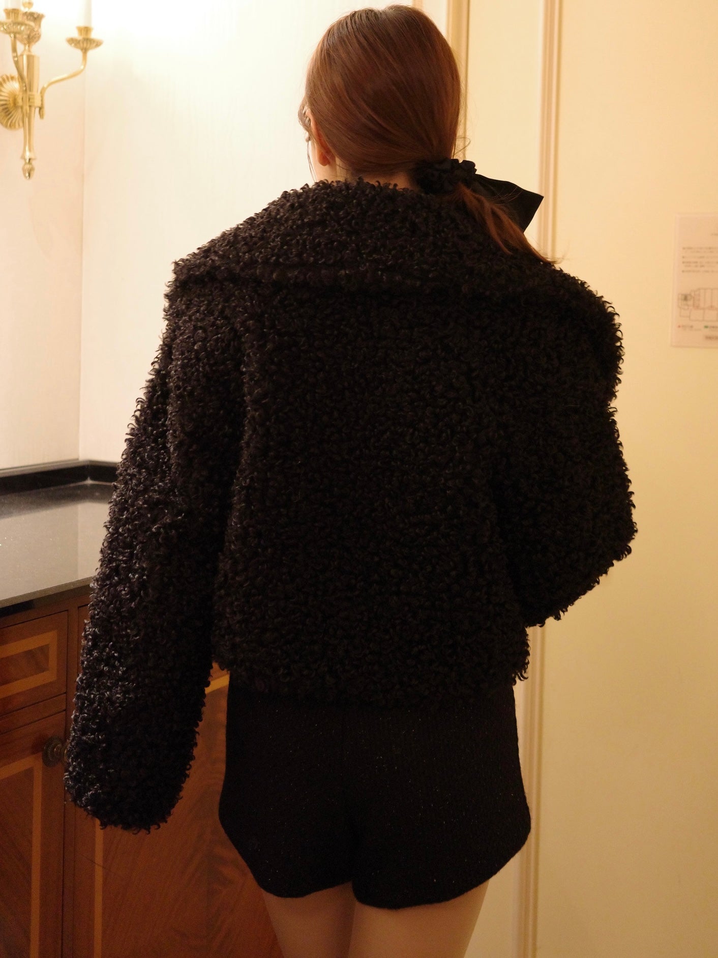 プードル素材のコートです。大きめの襟が顔まわりを華やかに見せてくれます。ショート丈なのでスカートやワンピースともバランスがとりやすく相性抜群♡厚手すぎず軽い着心地で、冬のおでかけにもぴったりな一枚です。着るだけでシーズンムードが高まる、主役級アウターです。
