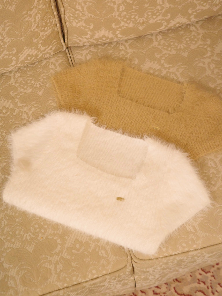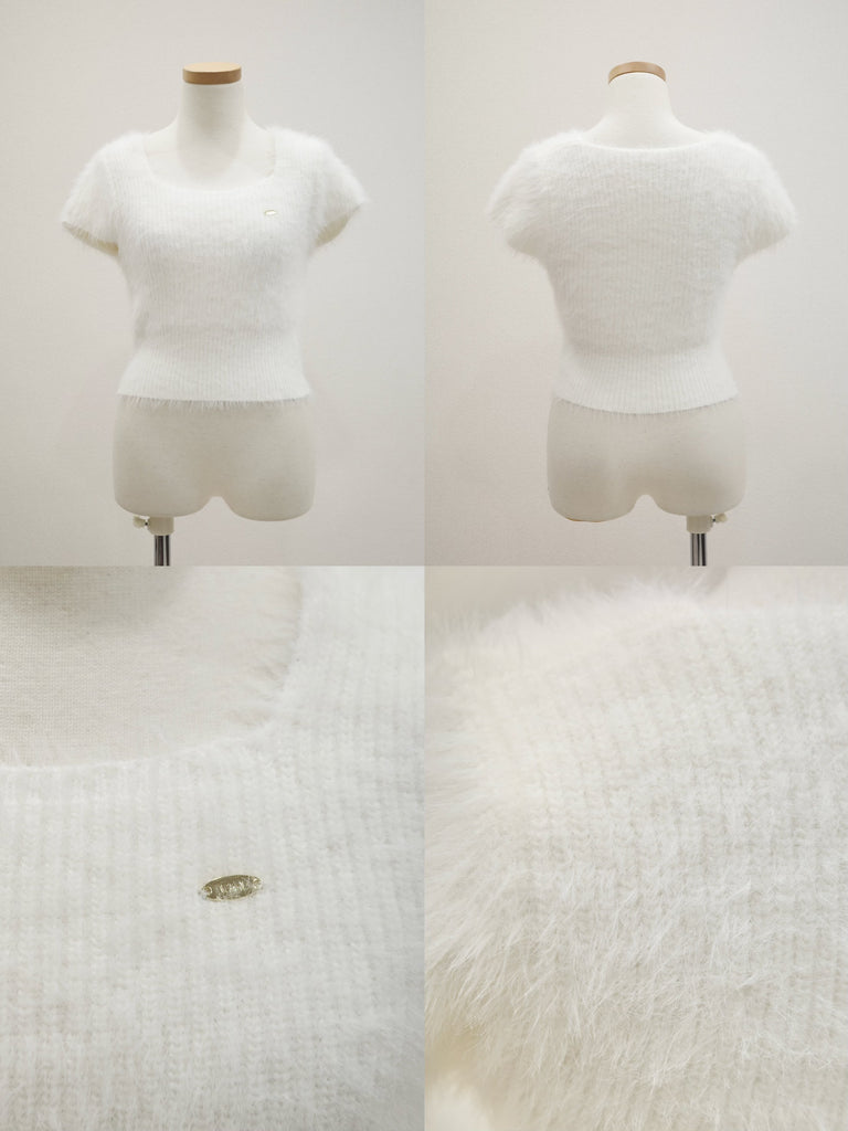 コンパクトな丈感が魅力のショートニットトップスです。ふわっとしたシャギーニット素材で柔らかな雰囲気に。スクエアネックがデコルテを綺麗に見せてくれます。肩や腕まわりのコンパクトなシルエットは華奢見せ効果もあり、1枚で着映える優秀アイテム。胸元にはCielオリジナルのゴールドプレートがさりげなく輝き、コーデに高級感をプラスします。